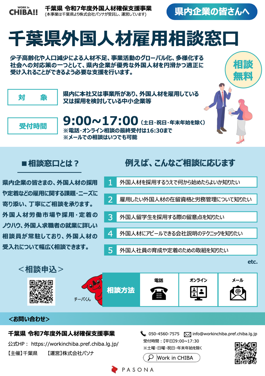 千葉県内の企業の皆さまの、外国人材の採用や定着などの雇用に関する課題・ニーズに寄り添い、丁寧にご相談を承ります。